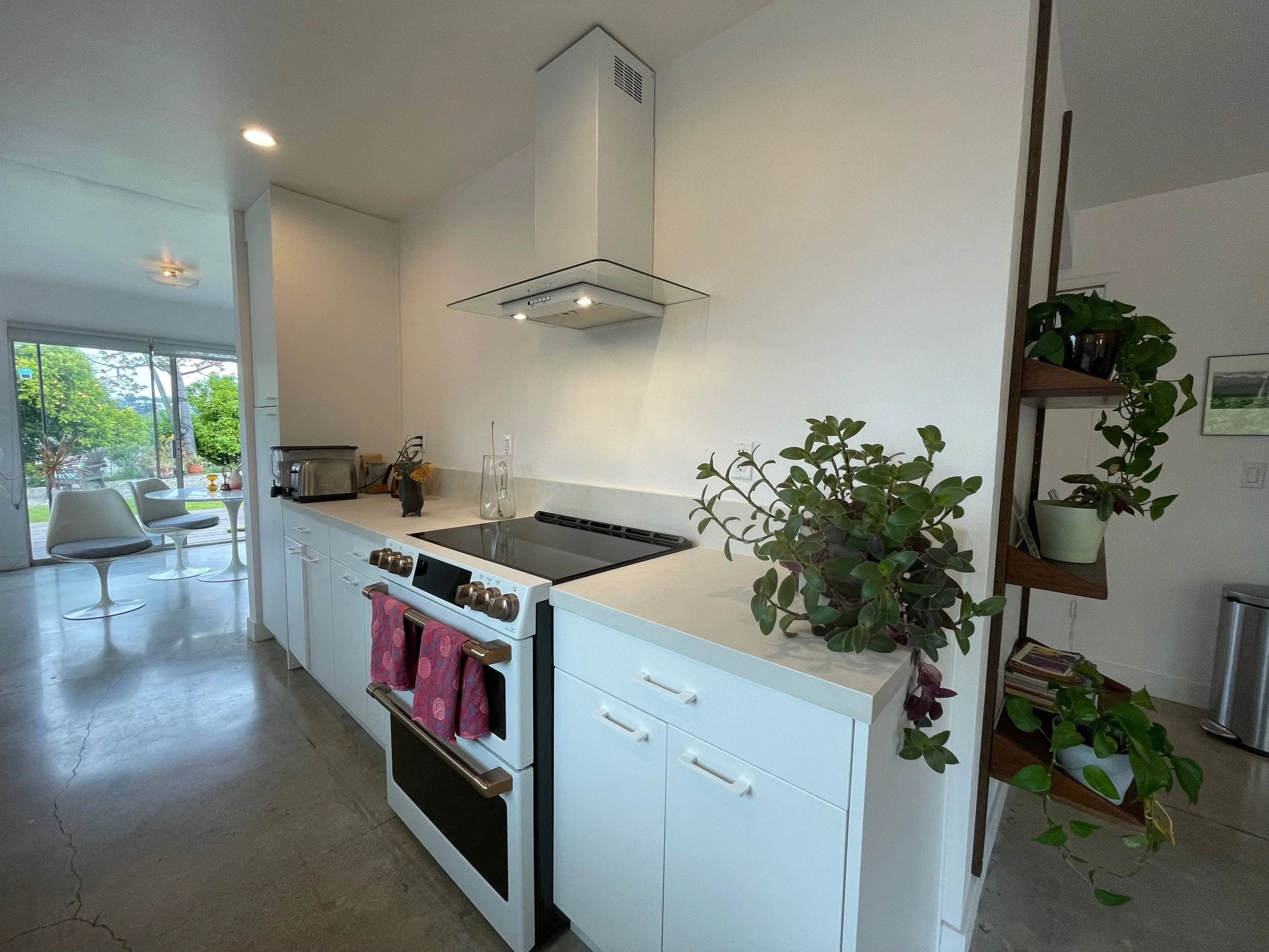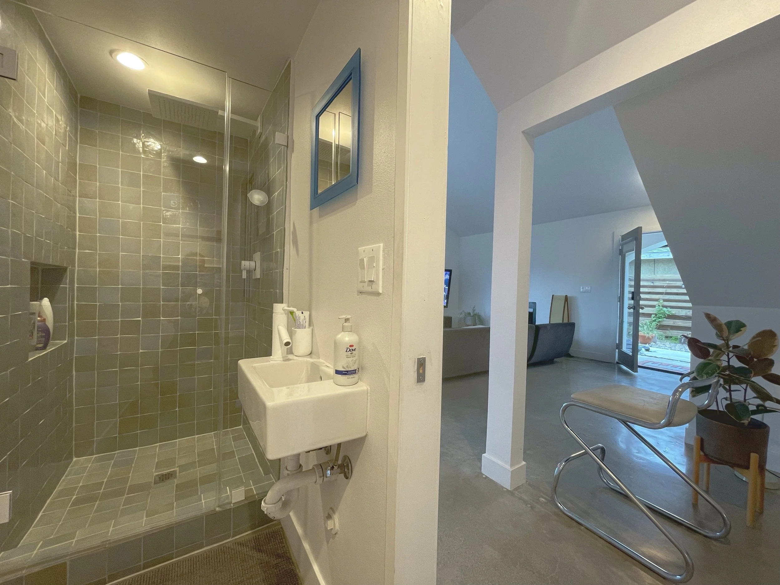 ‘The concrete flooring on the first floor is a beloved feature to my client, but especially to his dog, Bubba.’ It is always nice and cool to the touch. My client loves Brutalism architecture. So I encourage David to pull the budget from another line item. The process and result are equally rewarding.